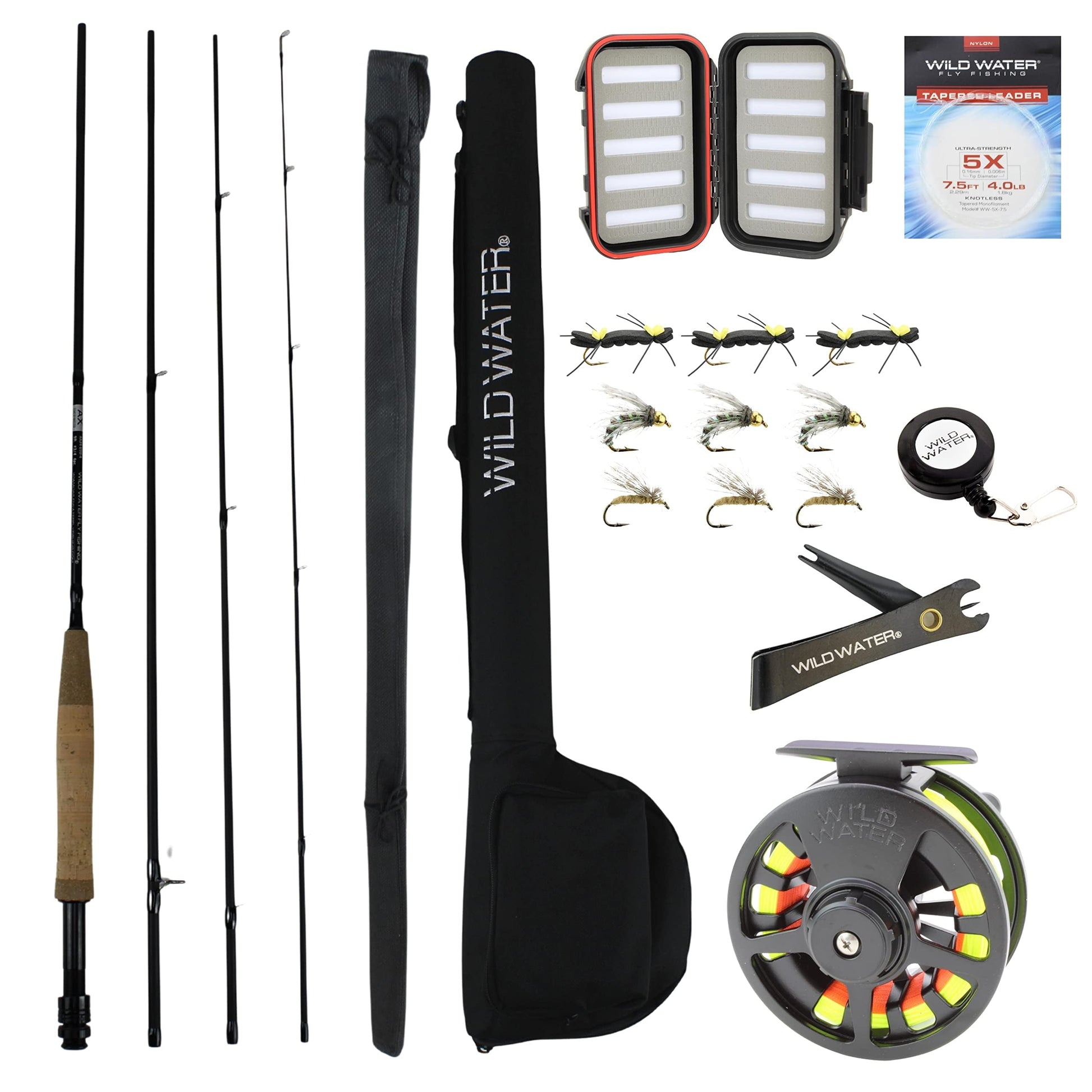 The Wild Water Fly Fishing Starter Package is the perfect way to start your fly fishing journey. With a high-quality 9-foot fly rod made of durable, light IM8 matte black graphite, weighing just 4.4 ounces, and featuring a high-quality reel seat with double lock rings, stainless steel stripper guide with silicon carbide rings and a laser-etched butt cap, you will be equipped for success. Ideal for adults and children, the package also includes a durable die cast aluminum fly reel with stainless steel internal components and an 85mm diameter quick release spool, adjustable disc drag for reliable performance on any body of water. To help you get started even quicker, we've included 9 flies in a waterproof fly box so you can save time tying your own! And all these components come in a durable nylon carrying case for travel and storage. So whether you're just starting out or if you're an experienced angler, the Wild Water Fly Fishing Starter Package has everything you could need - so get ready to make some memories out there!